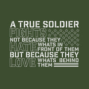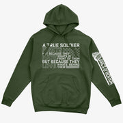 Wrap yourself in purpose and pride with this True Soldier hoodie from Rags of Honor. Featuring the powerful message, "A true soldier fights not because they hate what is in front of them but because they love what’s behind them," this hoodie honors the selfless dedication of those who serve.